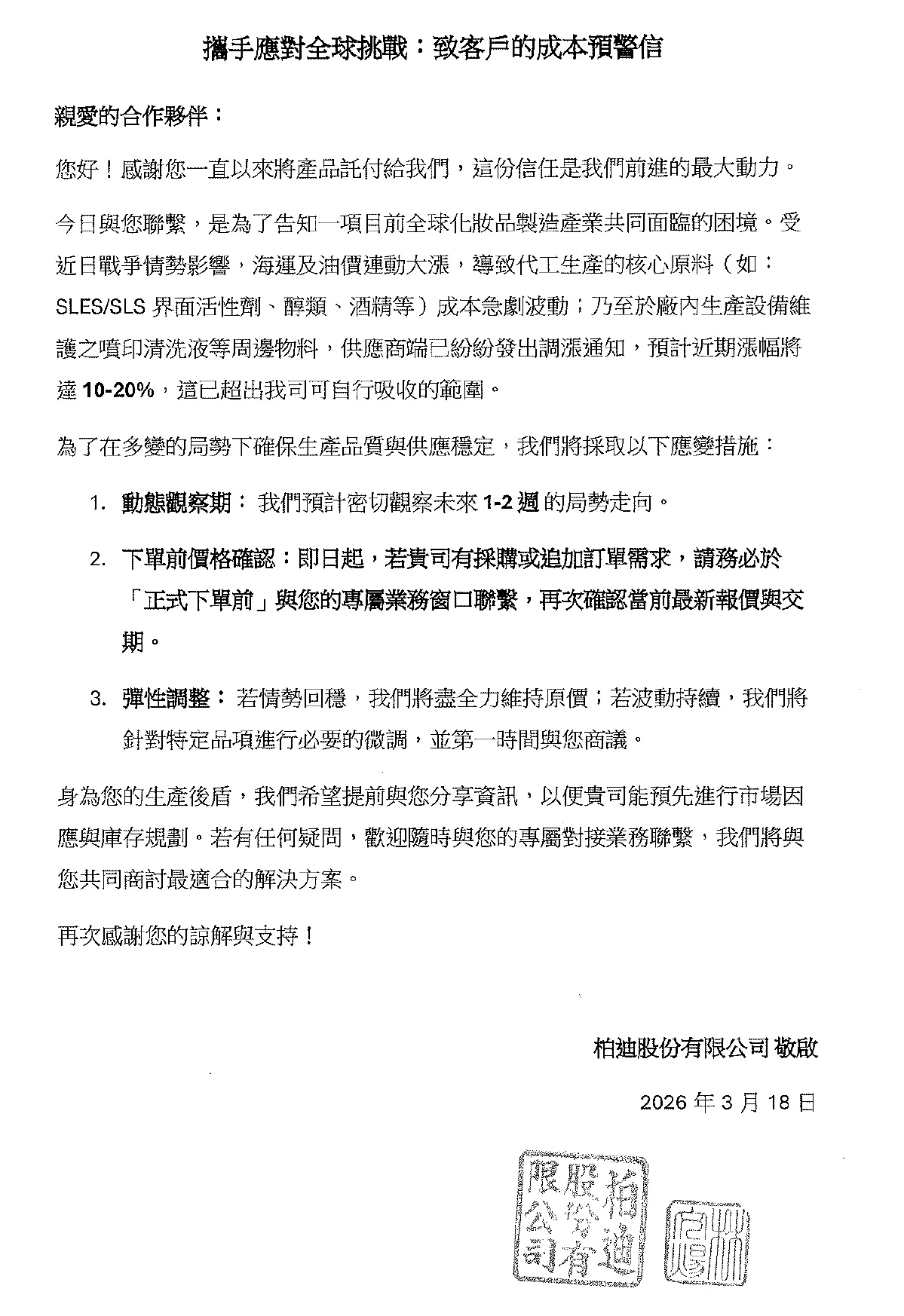 親 愛 的 合 作 夥 伴 您 好: