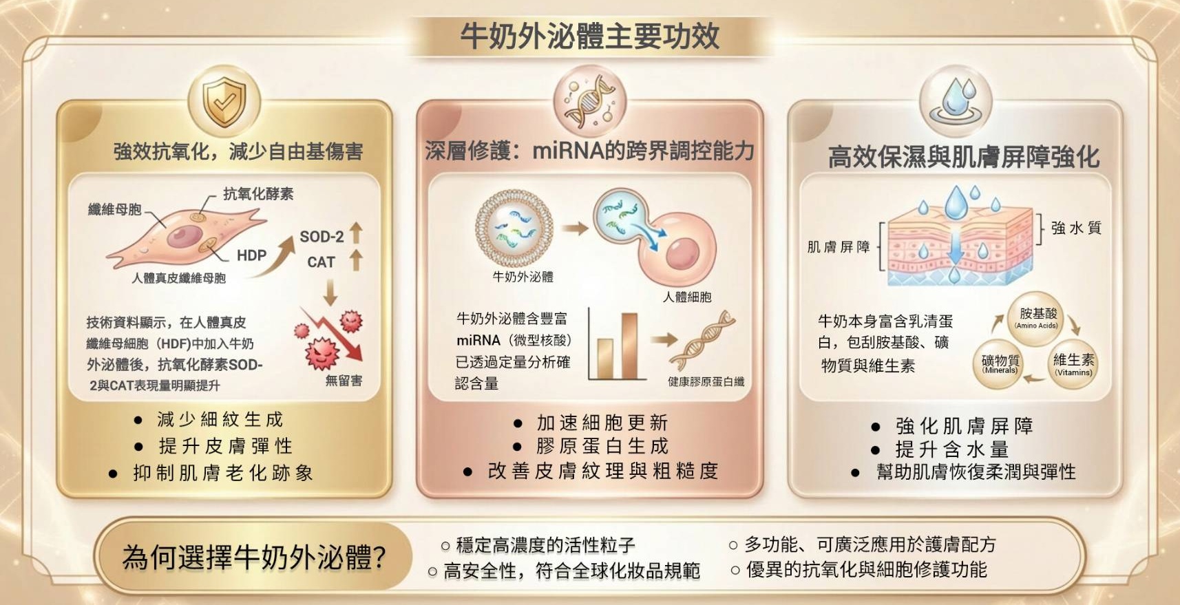 牛奶外泌體具備以下優勢: 穩定高濃度的活性粒子 以專利萃取技術確保不破壞外泌體結構。