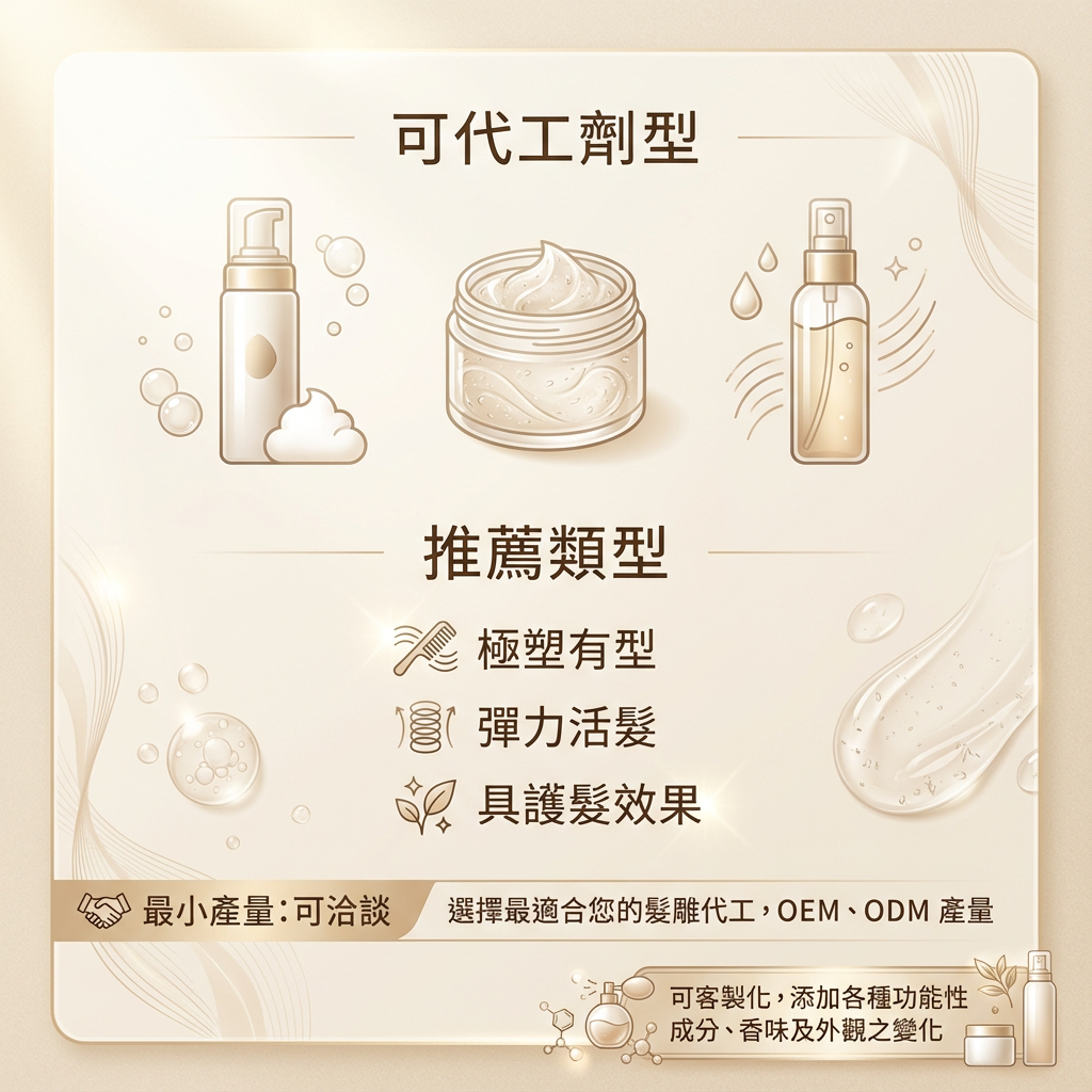 ◆ 可代工劑型 慕斯 · 膠體 · 液體 ◆ 推薦產品方向 ◎ 極塑有型定型表現 ◎ 彈力活髮造型效果 ◎ 兼具護髮功效配方 ◆ 最小生產量 產量可彈性洽談,依產品定位與銷售通路需求, 協助評估並規劃最適合您的 髮雕/造型品 OEM・ODM 生產規模。 ◆ 客製化開發 可依品牌需求客製化添加多種功能性成分、香味設計, 並提供質地、外觀與包裝形式之多元開發選項, 打造兼具造型力與護理效果的差異化專屬產品。