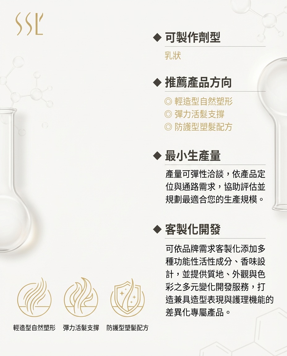◆ 可製作劑型 乳狀 ◆ 推薦產品方向 ◎ 輕造型自然塑形 ◎ 彈力活髮支撐 ◎ 防護型塑髮配方 ◆ 最小生產量 產量可彈性洽談,依產品定位與通路需求, 協助評估並規劃最適合您的生產規模。 ◆ 客製化開發 可依品牌需求客製化添加多種功能性活性成分、香味設計, 並提供質地、外觀與色彩之多元變化開發服務, 打造兼具造型表現與護理機能的差異化專屬產品。